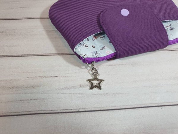 Deze paarse telefoonclutch van ribstof is klein maar stijlvol. De binnenzijde heeft een bloemenvoering en de drukknoop houdt alles netjes dicht.